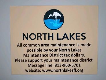 The North Lakes Maintenance District is a Hillsborough County dependent tax district. The District was originally set up in 1985 under County ordinance #85-39. The County collects the taxes for the District and provides the ordinance or regulations that give authority to the District. Funds are derived from the County non-ad valorem tax of $70 per residential unit.